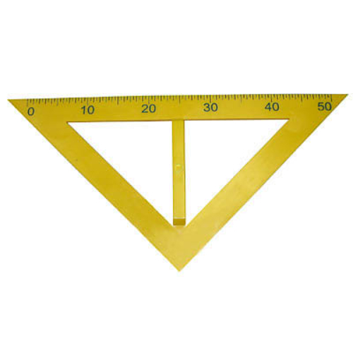 Предназначен для геометрических построений и линейных измерений. Изготовлен из пластмассы, снабжен ручкой, ярко окрашен. На основание равнобедренного треугольника нанесена шкала (50 см) с ценой деления 0,5 см и оцифровкой через 10 см. Позволяет чертить углы 45, 90 и 135 градусов, перпендикулярные прямые, равнобедренные треугольники и другие геометрические фигуры на классной доске.