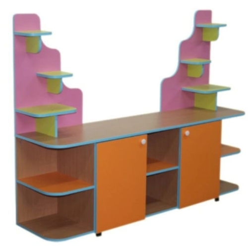 Материал: ЛДСП. Размер: 170*42*130 см. Описание: Основной цвет бук или кремовый. Фасады цветные по желанию заказчика. Нижняя часть уголка представляет собой двух тумбовый стол с дверками, разделенными двумя открытыми полками. Внутри тумб по две полки. По бокам, с краев — сегменты с двумя полками. Над столешницей с двух крайних сторон — симметричные декоративные элементы фигурной формы из ЛДСП, на которых по три полочки на консолях. Данные для транспортировки: объем 0,125 м3., вес 92 кг., 2 места.