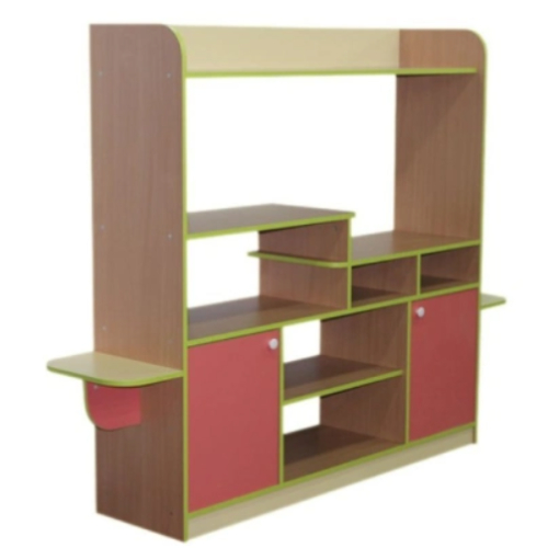 Материал: ЛДСП. Размер: 196*40*150 см. Описание: Основной цвет бук или кремовый. Фасады цветные по желанию заказчика. Стеллаж с двумя закрытыми шкафчиками в нижней части, разделенных между собой открытыми полками. Над закрытыми шкафами располагаются две горизонтальные полки на разной высоте, по размеру чуть длиннее половины стеллажа и соединены между собой вертикальной планкой. В самом верху стеллажа еще одна полка с задней стенкой из ЛДСП, боковины стеллажа скруглены вверху, с обеих сторон, на уровне закрытых шкафов по одной полке на консоли. Данные для транспортировки: объем 0,1 м3., вес 89 кг.